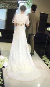フロント部分にはレースのくるみぼたんをたくさん並べて留めてあります。