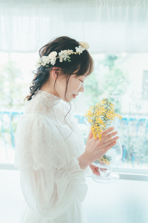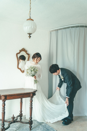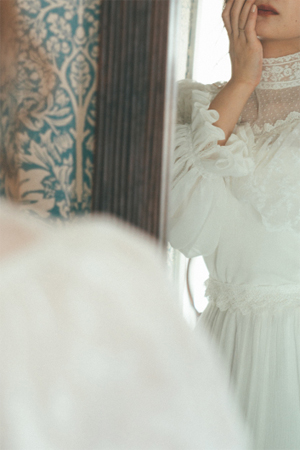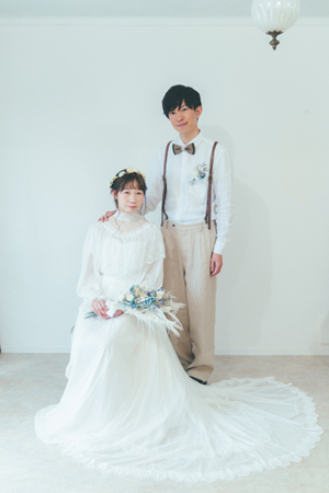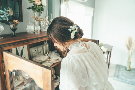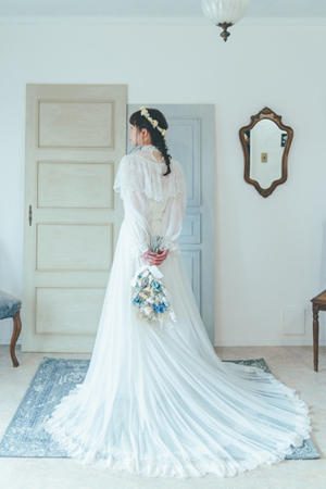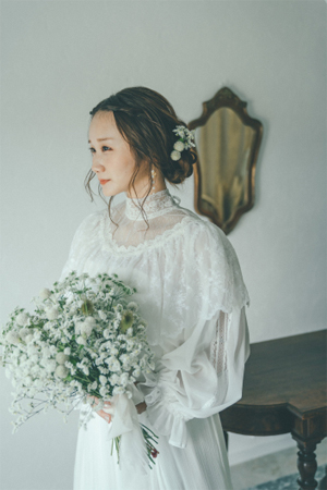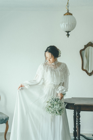 ヴィンテージライクなブラウスとビスチェドレスを組み合わせたスタイルです