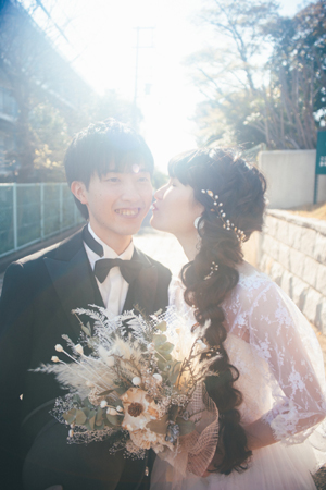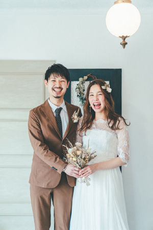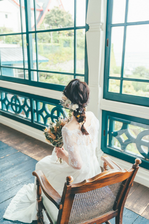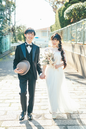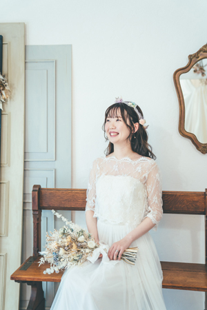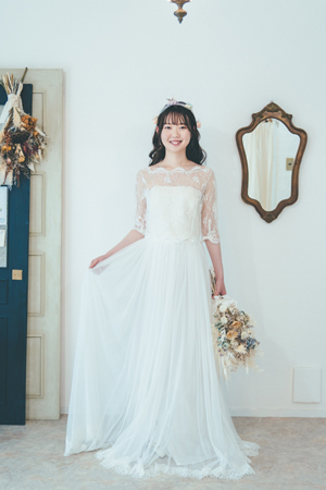 オフショルダーのレースボレロとビスチェドレスを組み合わせたスタイルです