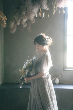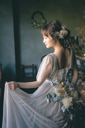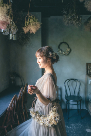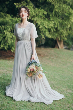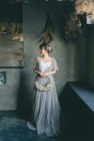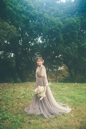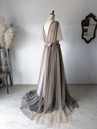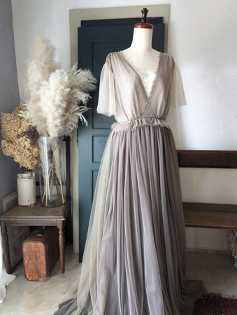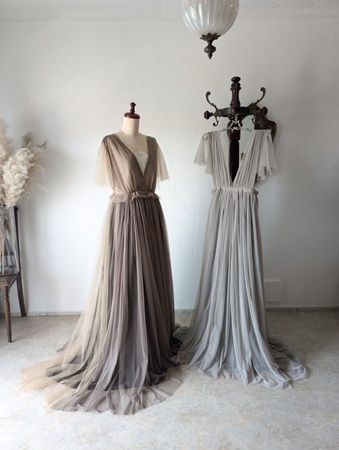 グレージュとオリーブ色のチュールを重ねたオーバードレスです シンプルなウエディングドレスの上に重ねて着用することでカラードレスとして着ていただけます。 お色違いのオーダーや、レンタルも可能ですのでお気軽にお問合せください。 ●オーダー(オーバードレスのみ45,000円、インナードレス代別) |