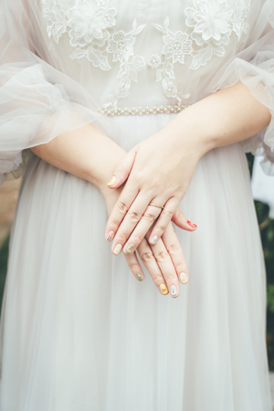 チュール生地にレースを縫い留めビジュー刺繍を施しています。