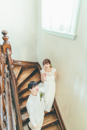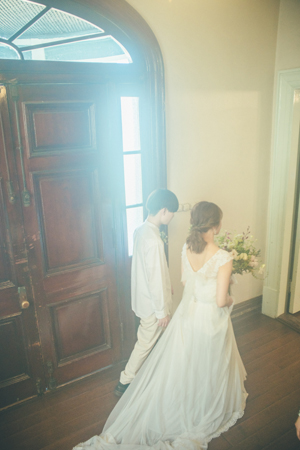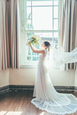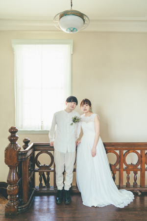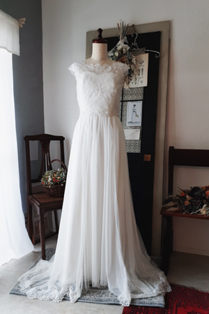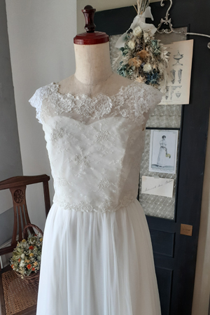 フレンチスリーブのレースボレロとビスチェドレスを組み合わせたスタイルです