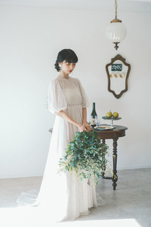 首元やバックスタイルに細いベロアリボンをあしらって可憐な雰囲気のあるスタイルです。