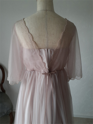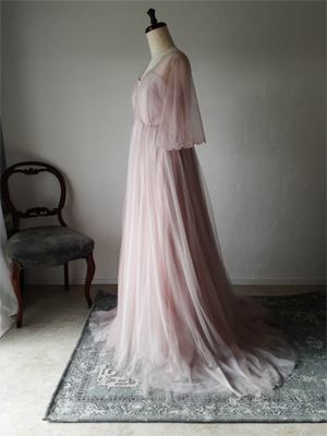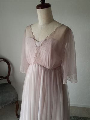 お肌に馴染むグレイッシュローズピンクのチュール生地に、一粒ずつ手縫いでビーズをつけています